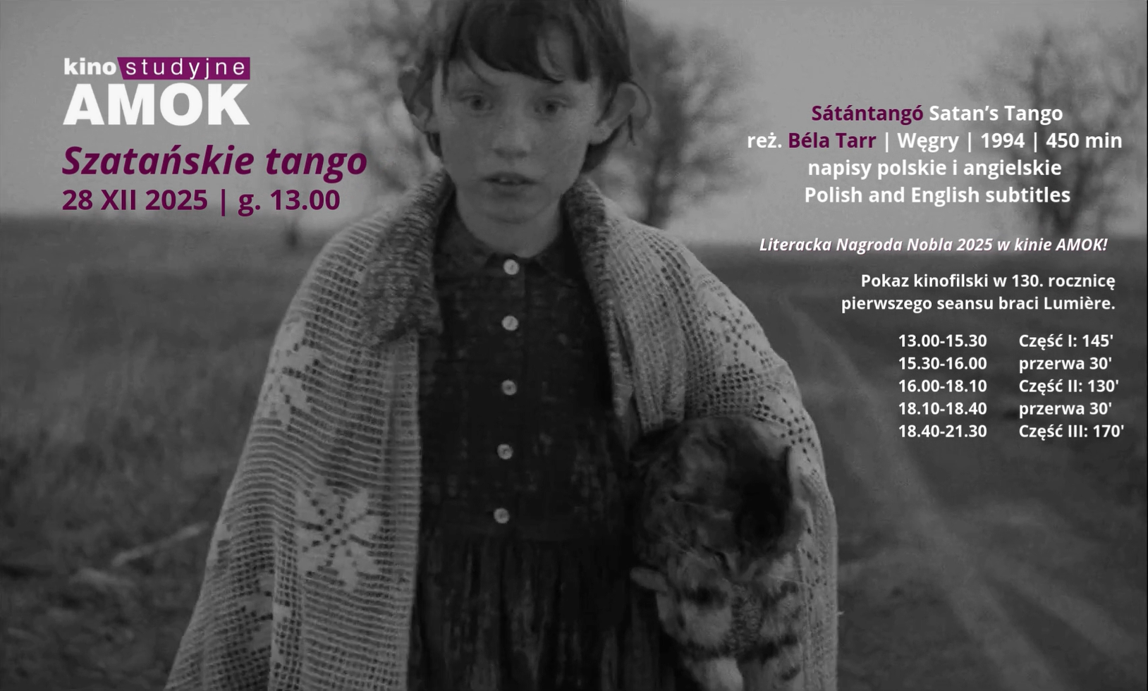 Z tej okazji, po raz pierwszy u nas, pokażemy 7,5-godz. „Szatańskie tango” Béli Tarra. Scenariusz filmu powstał na podstawie powieści Krasznahorkaia pod tym samym tytułem. Jest to jednak ekranizacja szczególna: węgierscy przyjaciele Tarr i Krasznahorkai ściśle współpracowali nad scenariuszem i całokształtem filmu.