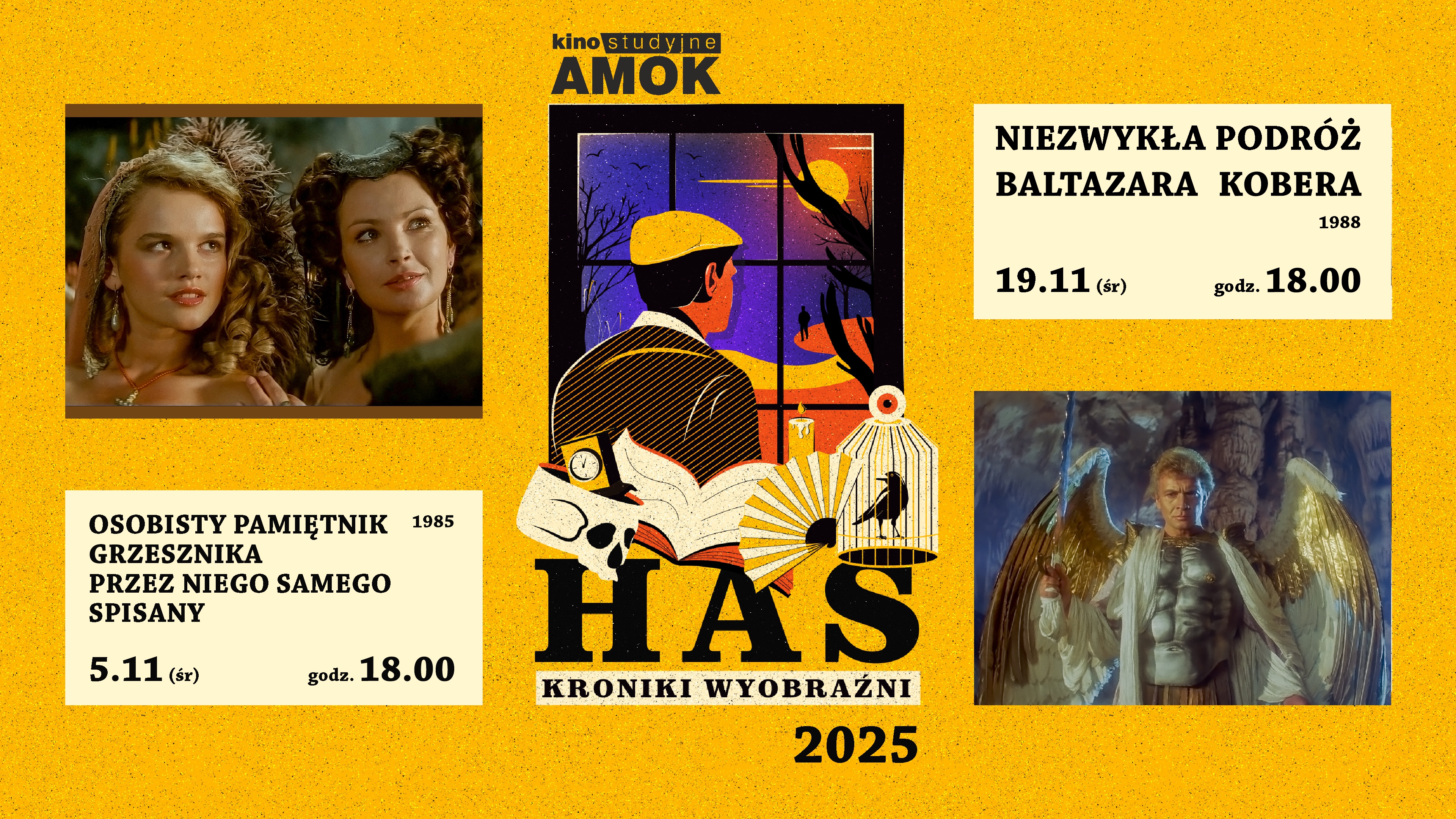 Rok 2025 został ustanowiony rokiem Wojciecha Jerzego Hasa a w setną rocznicę urodzin jednego z najwybitniejszych twórców naszych czasów zaprosimy na nowy przegląd filmowy HAS. KRONIKI WYOBRAŹNI. W kinie AMOK zaprezentujemy wszystkie wyreżyserowane przez niego filmy fabularne. Pokazy odbywać się będą dwa razy w miesiącu, w środy, od kwietnia do listopada 2025, z wyjątkiem lipcowej przerwy wakacyjnej