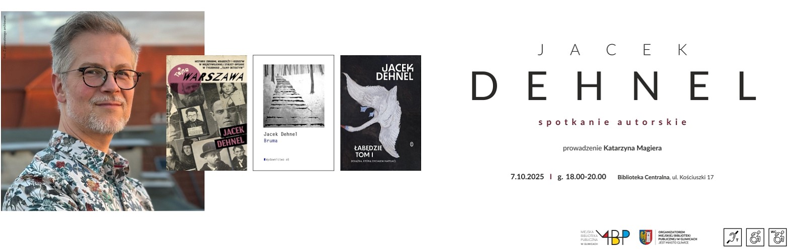 Gościem biblioteki będzie Jacek Dehnel — poeta, prozaik, tłumacz. Wydał m.in. dziewięć tomów poetyckich, przekłady (Larkin, James, Verdins, Fitzgerald, White, Spark), pięć powieści („Lala”, „Saturn”, „Matka Makryna”, „Krivoklat”, „Ale z naszymi umarłymi”) i kilka tomów krótszych próz, a wspólnie z mężem, Piotrem Tarczyńskim – serię kryminałów o profesorowej Szczupaczyńskiej (pod pseudonimem Maryla Szymiczkowa). Laureat m.in. Nagrody Kościelskich (2005) i Paszportu „Polityki” (2006), był pięciokrotnie nominowany do nagrody Nike, trzykrotnie do Angelusa, raz do Nagrody Szymborskiej. Prowadzi bloga www.tajnydetektyw.blogspot.com i portal z kolekcją starej fotografii www.awers-rewers.pl. Mieszka w Warszawie. Prowadzenie: Katarzyna Magiera.