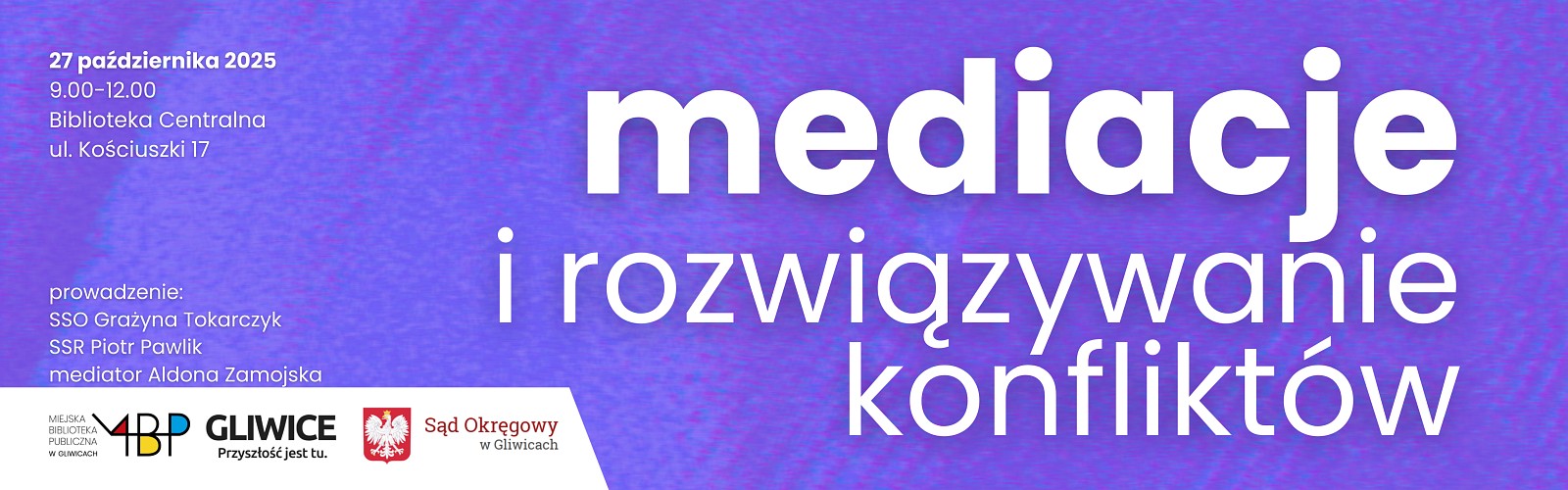 Miejska Biblioteka Publiczna w Gliwicach zaprasza nauczycieli gliwickich szkół na warsztaty poświęcone mediacjom i sposobom rozwiązywania konfliktów w środowisku edukacyjnym. Spotkanie poprowadzą: sędzia Grażyna Tokarczyk – Wiceprezes Sądu Okręgowego w Gliwicach, sędzia Piotr Pawlik oraz mediator Aldona Zamojska. Program obejmuje wprowadzenie do tematyki, prelekcję ekspertów oraz sesję pytań i odpowiedzi.
