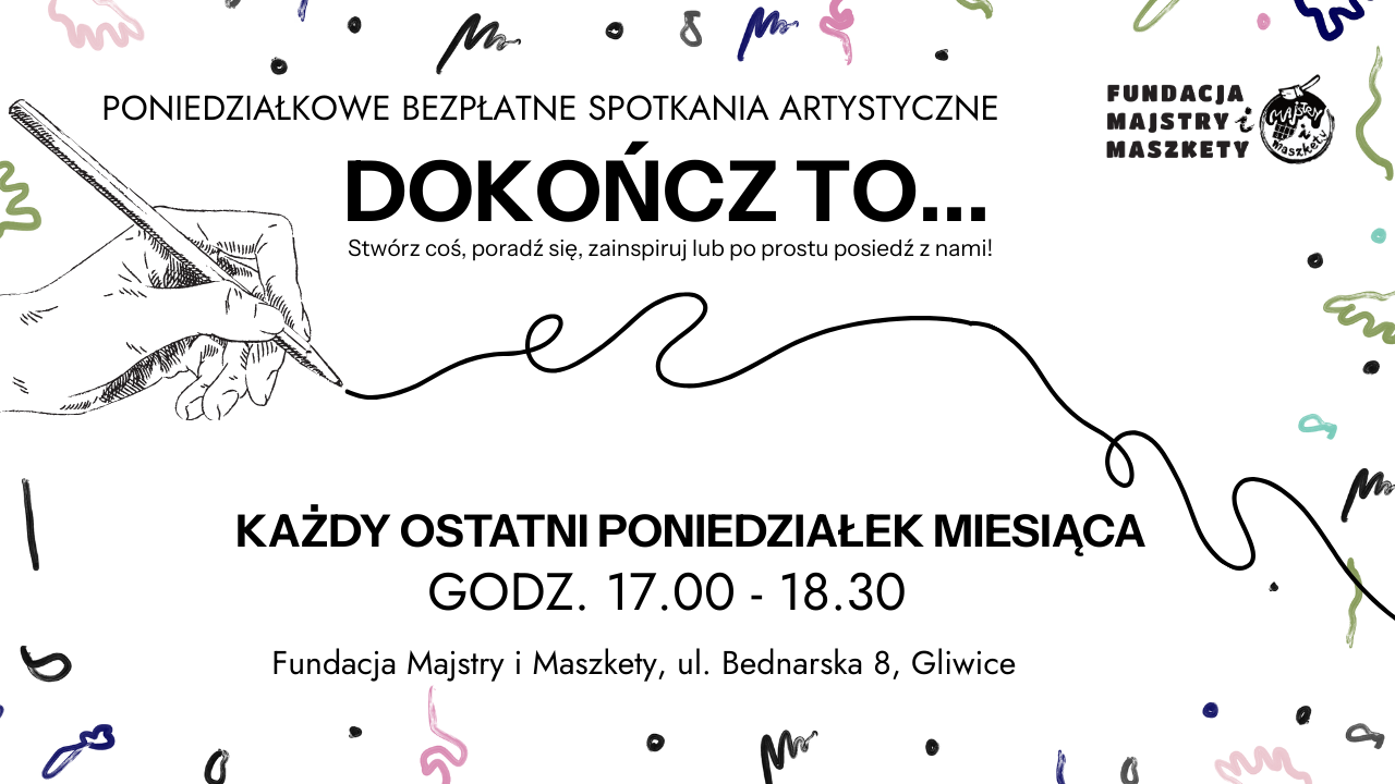 Na czym to polega? Fundacja Majstry i Maszkety udostępnia przestrzeń dla wszystkich zainteresowanych sztuką, swobodnym rysowaniem. Wpadajcie powymieniać się inspiracjami i umiejętnościami, można coś porysować z martwych natur, możemy wymyślić wspólny temat rysowania lub DOKOŃCZ wreszcie ten projekt co dawno temu zacząłęś/zaczęłaś! Weźcie ze sobą swoje akcesoria malarskie/rysunkowe, coś do schrupania i wpadajcie! Jeśli chcesz wesprzeć inicjatywę oraz dorzucić się do materiałów do użytku dla tych, co takowych nie posiadają zerknij tutaj: https://zrzutka.pl/jxk6wk godz. 17:00 - 18.30 Fundacja Majstry i Maszkety Wstęp wolny PS. Jeśli masz w domu zbędne farby, ołówki, kredki cokolwiek - chętnie przygarniemy. Do zobaczenia!