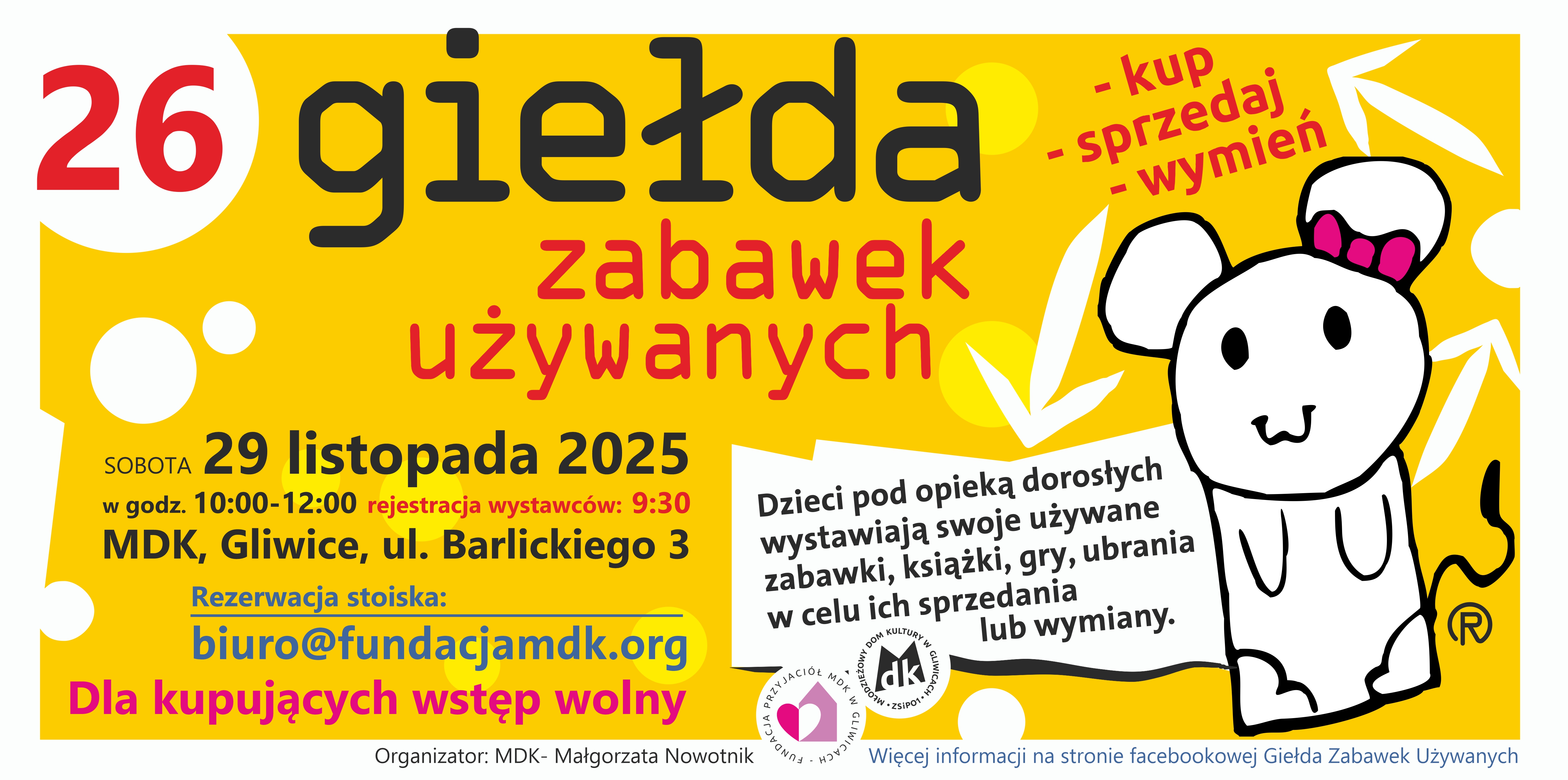 Zapraszam na 26 Giełdę Zabawek Używanych , 29 listopada 2025 w sobotę, (tuż przed samym Mikołajem - można kupić fajne prezenty). Giełdę odbędzie się w godzinach od 10-12 w Młodzieżowym Domu Kultury w Gliwicach . Rezerwacja stoiska będzie możliwa w dniach od 14 października najpóźniej do 25 listopada lub do wyczerpania miejsc. Najpierw trzeba wysłać email na adres: biuro@fundacjamdk.org zapytać czy są wolne miejsca, wtedy wysyłany jest email zwrotny z danymi do przelewu: kwota 15 zł i trzeba jak najszybciej dokonać przelewu na konto MDK. Potwierdzenie wpłaty wysłać na ten sam adres email i po mailu zwrotnym stoisko jest zarezerwowane. Jedna osoba może zarezerwować jedno stoisko, decyduje kolejność zgłoszeń , liczba stoisk jest ograniczona.