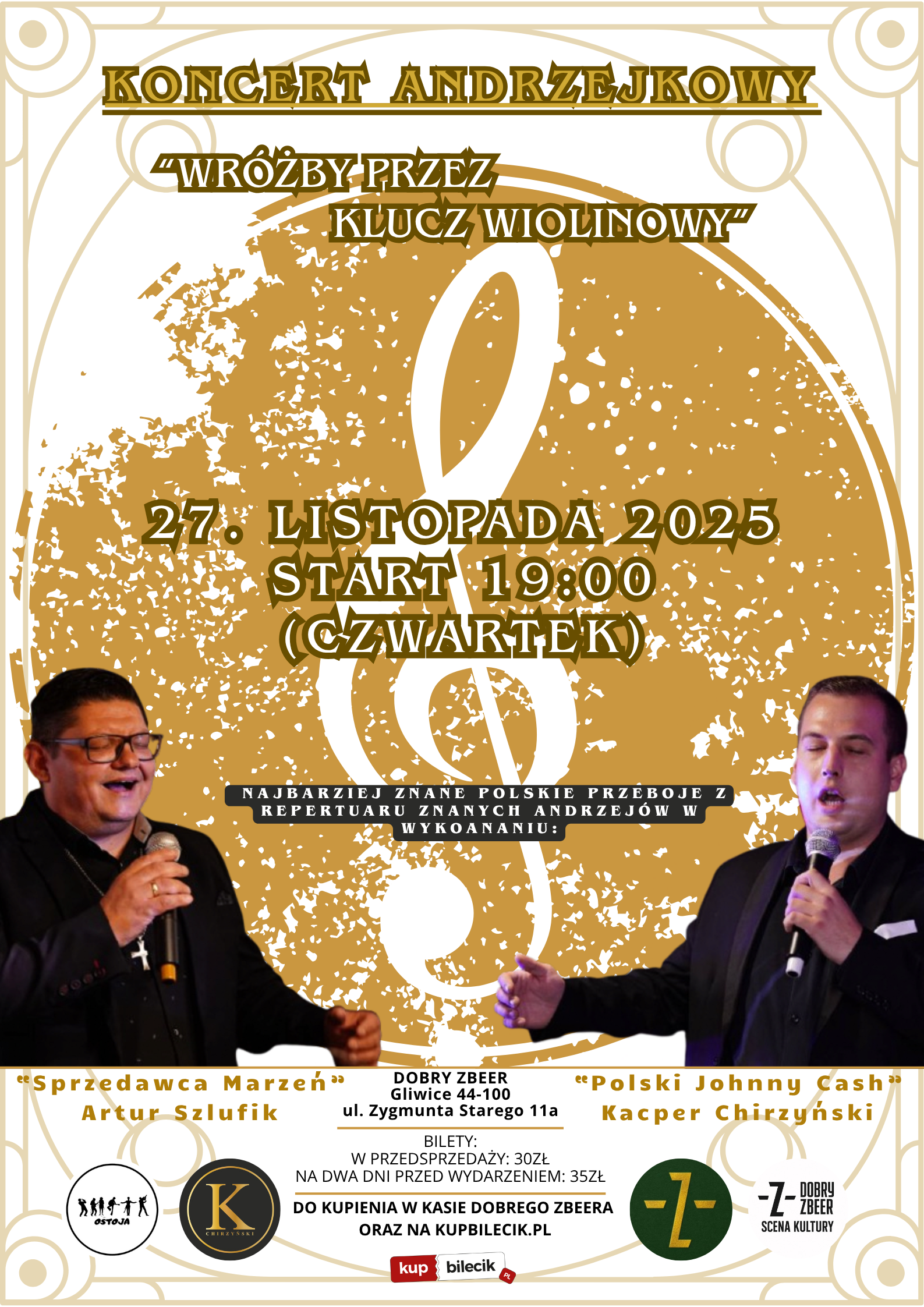 Piosenki znanych Andrzejów! – Koncert Andrzejkowy w Dobrym Zbeerze, 27 listopada (czwartek), Start: 19:00, Dobre Zbeer, ul. Zygmunta Starego 11A, Gliwice Zapraszamy na wyjątkowy koncert andrzejkowy, podczas którego zabrzmią największe piosenki znanych Andrzejów – od Piaska przez Sikorowskiego po Zauchę, od Rybińskiego przez Grabowskiego po Dąbrowskiego! ???? Czeka Was wieczór pełen dobrej muzyki, humoru i klimatu, którego nie da się podrobić. Idealna okazja, by rozpocząć andrzejkowy weekend z przytupem! ✨ Wystąpią: Artur "Sprzedawca Marzeń" Szlufik "Polski Johnny Cash" Kacper Chirzyński. Bilety: 30 zł – przedsprzedaż 35 zł – od dwóch dni przed wydarzeniem. Bilety dostępne: w kasie Dobrego Zbeera online na kupbilecik.pl