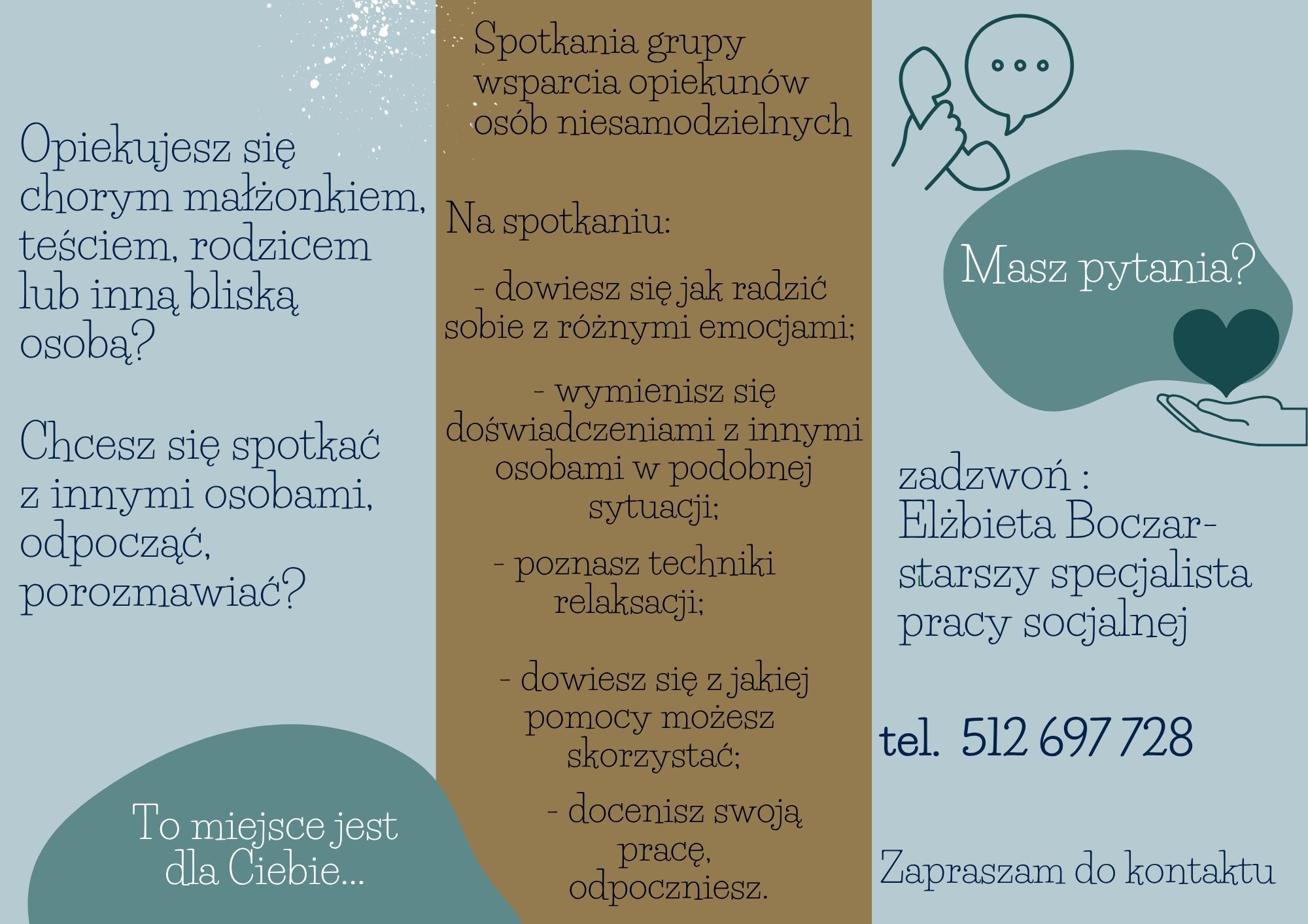 Jeżeli opiekujecie się chorym małżonkiem, teściem, rodzicem lub bliską osobą i chcecie się spotkać z innymi osobami, odpocząć, porozmawiać - zapraszamy Was na spotkanie grupy wsparcia dla opiekunów osób zależnych. Może macie takie osoby w swoim towarzystwie? Prosimy - przekażcie im tę wiadomość. Grupa jest otwarta dla wszystkich mieszkańców Gliwic.