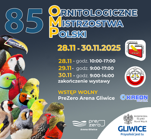 Już 28–30 listopada 2025 zapraszamy do PreZero Areny Gliwice na 85. Ornitologiczne Mistrzostwa Polski – wydarzenie, które co roku przyciąga hodowców, pasjonatów i miłośników ptaków z całego kraju.