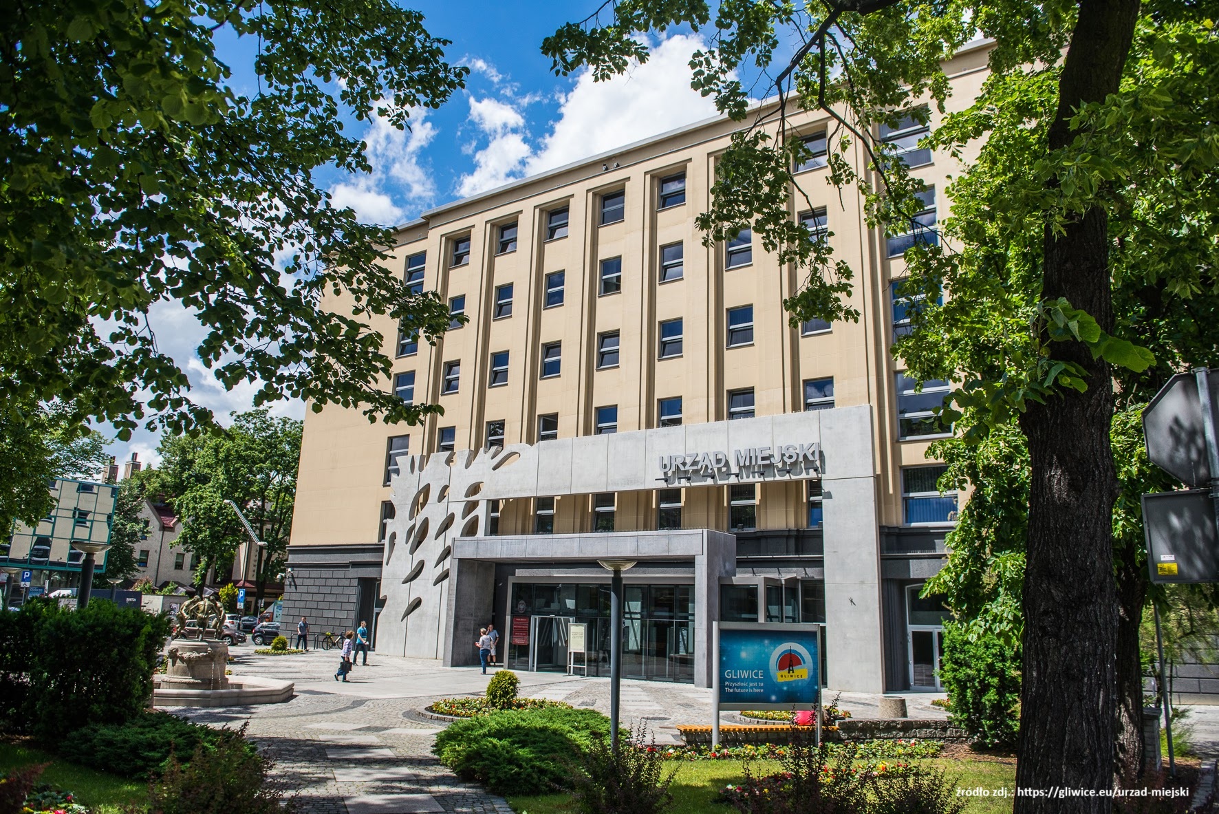 na zewnątrz budynku – w pobliżu wejścia głównego, na elewacji od strony ul. Zwycięstwa