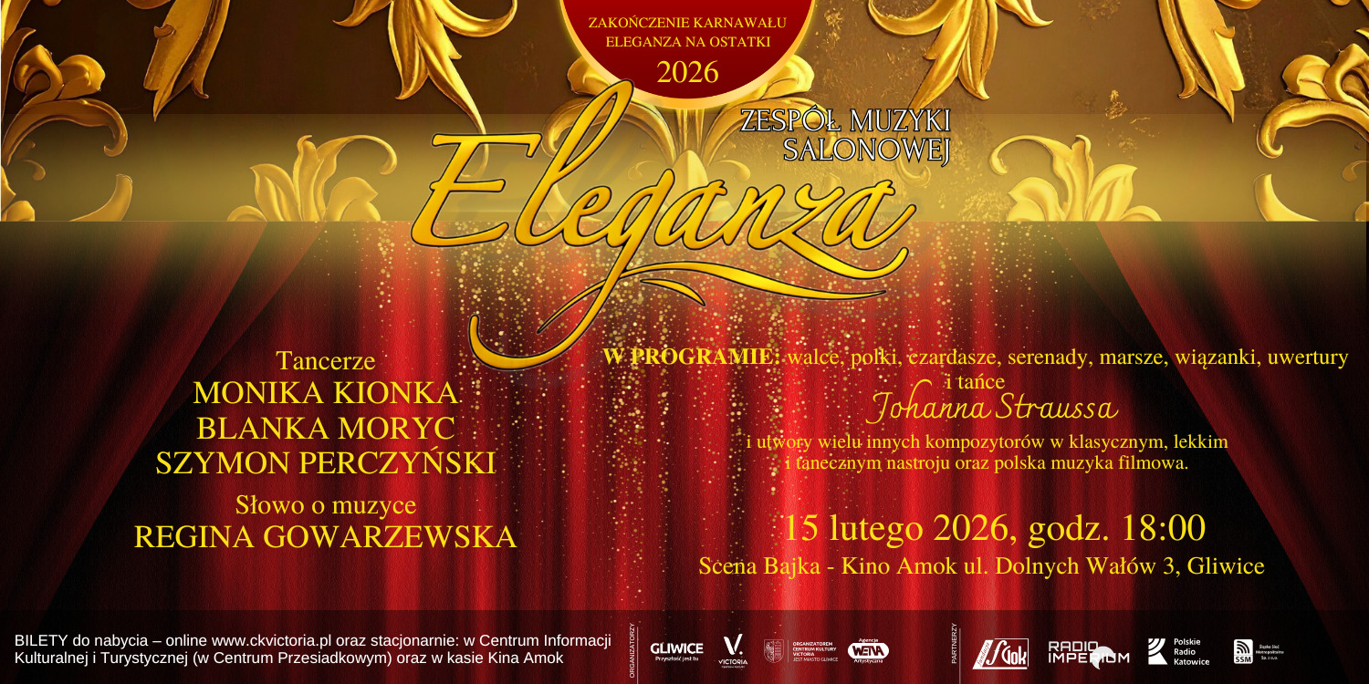 Karnawał w Gliwicach pożegnamy przy dźwiękach muzyki, która królowała w XIX-wiecznej Europie. Ceniony przez publiczność ZESPÓŁ MUZYKI SALONOWEJ, wspólnie z tancerzami, stworzy atmosferę wytwornego balu rodem z dawnego Wiednia. Tradycyjnie w repertuarze pojawią się także znane i lubiane utwory z polskiej muzyki filmowej.