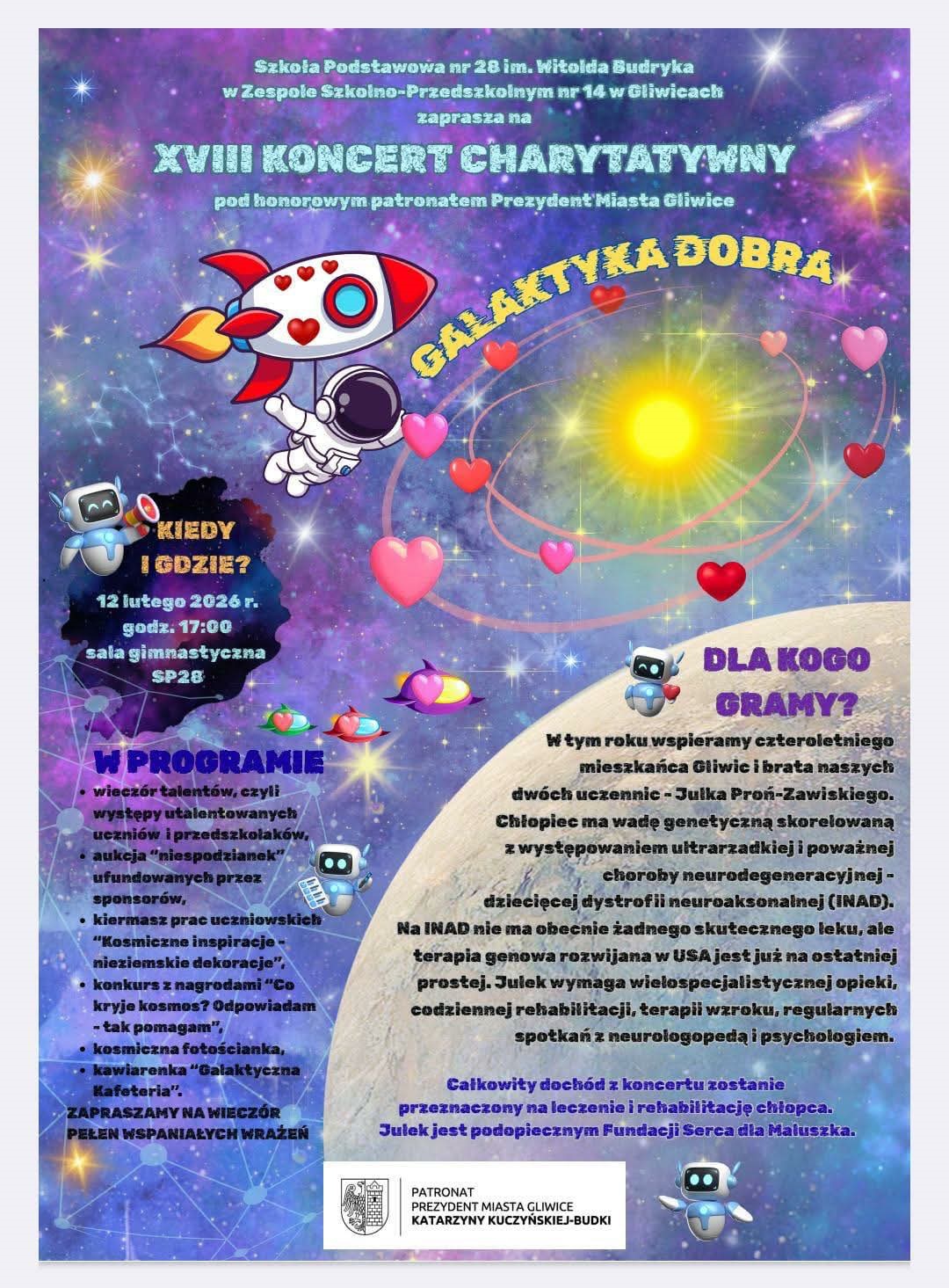 XVIII KONCERT CHARYTATYWNY pod hasłem "GALAKTYKA DOBRA" 12 lutego 2026r. o godz. 17:00 w sali gimnastycznej szkoły podstawowej nr 28 w Gliwicach. Gramy dla Julka!