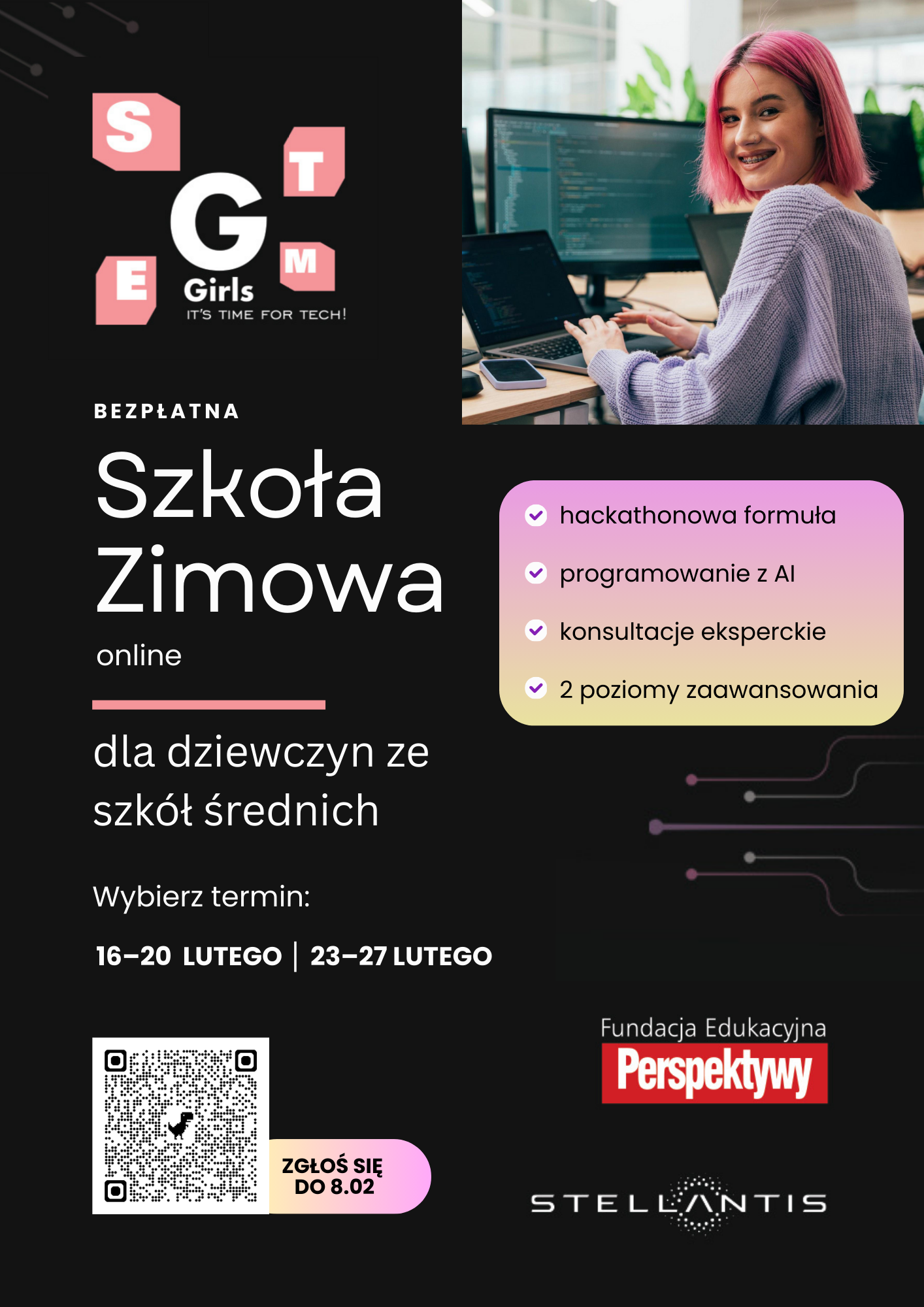 Fundacja Edukacyjna Perspektywy w ramach programu „Girls, it’s time for tech” dla dziewczyn ze szkół średnich, realizowanego we współpracy ze Stellantis , jako mecenasem projektu, pod patronatem Ministerstwa Edukacji Narodowej - uruchamia w 2 połowie lutego Szkołę Zimową dla wszystkich uczennic szkół średnich w Polsce mających ferie zimowe w III turnusie, w dniach 16-27 lutego 2026 r.