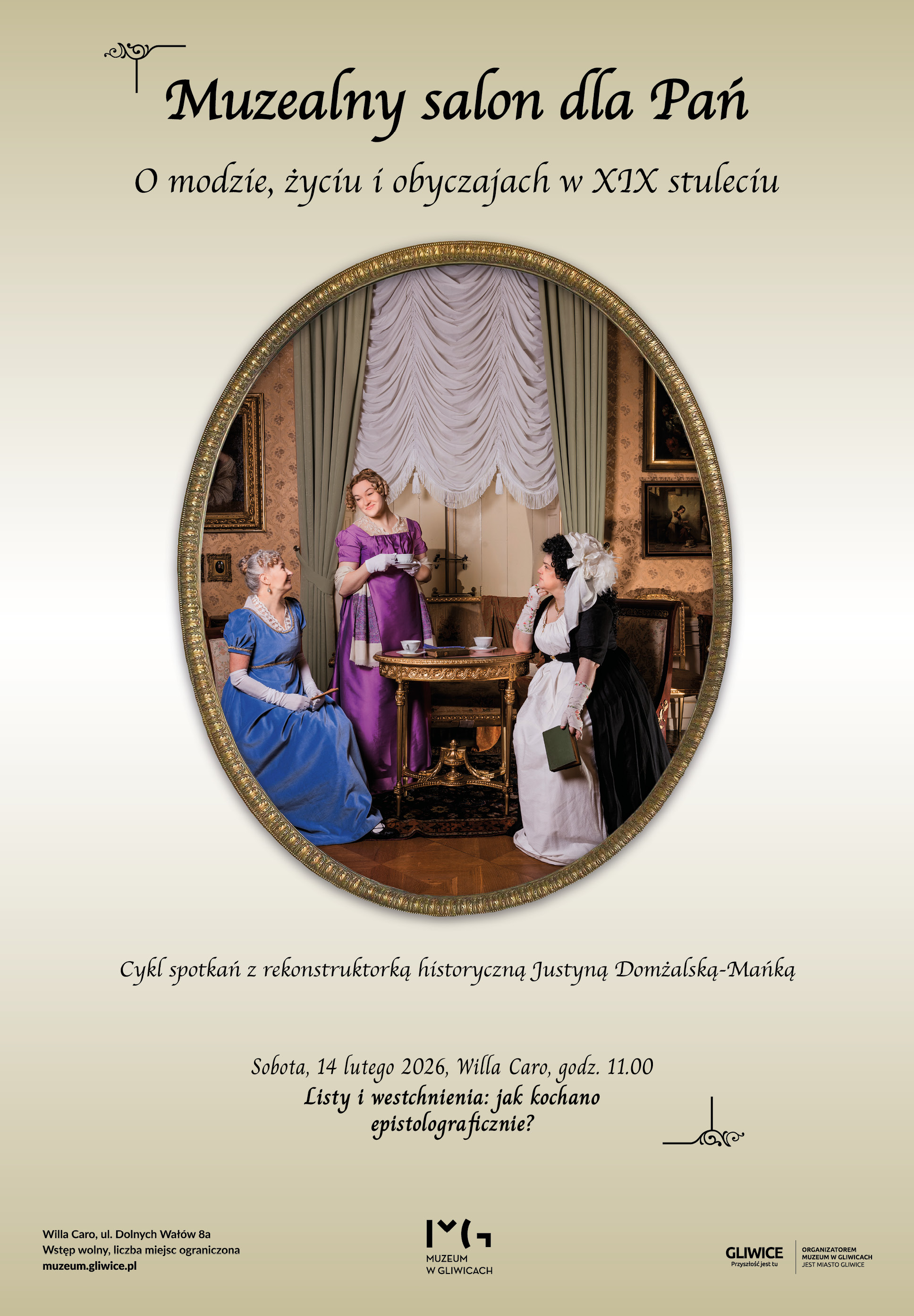Cykl wykładów: Muzealny salon dla Pań| Prowadzenie:| Justyna Domżalska-Mańka, rekonstruktorka historyczna Wstęp wolny, liczba miejsc ograniczona| Organizator:| Muzeum w Gliwicach
