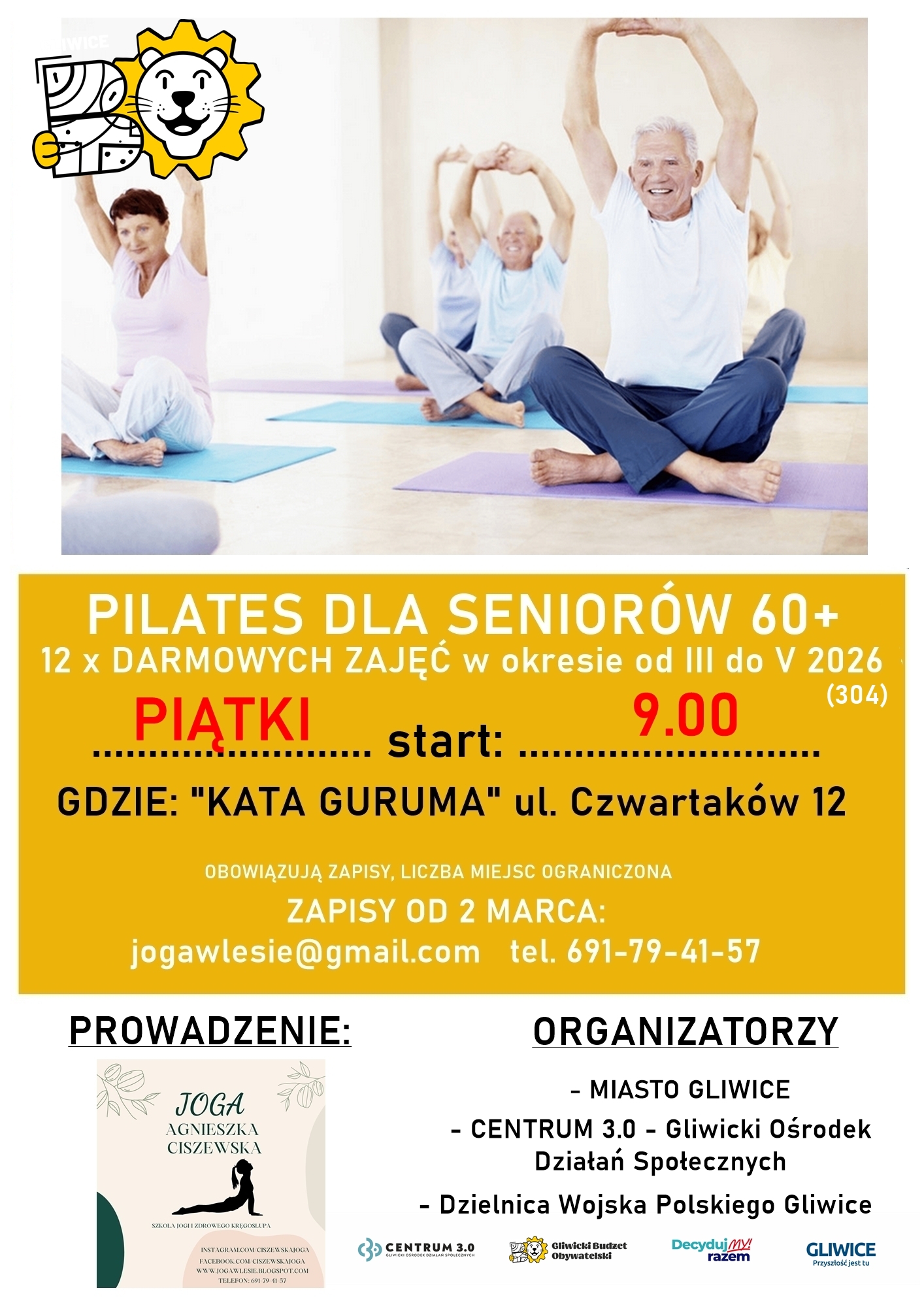 Zapraszamy seniorów (60+) z dzielnicy Wojska Polskiego w Gliwice na cykl bezpłatnych zajęć pilatesu. To doskonała propozycja dla osób, które chcą poprawić sprawność fizyczną, wzmocnić mięśnie, zadbać o kręgosłup oraz aktywnie spędzić czas w przyjaznej atmosferze.