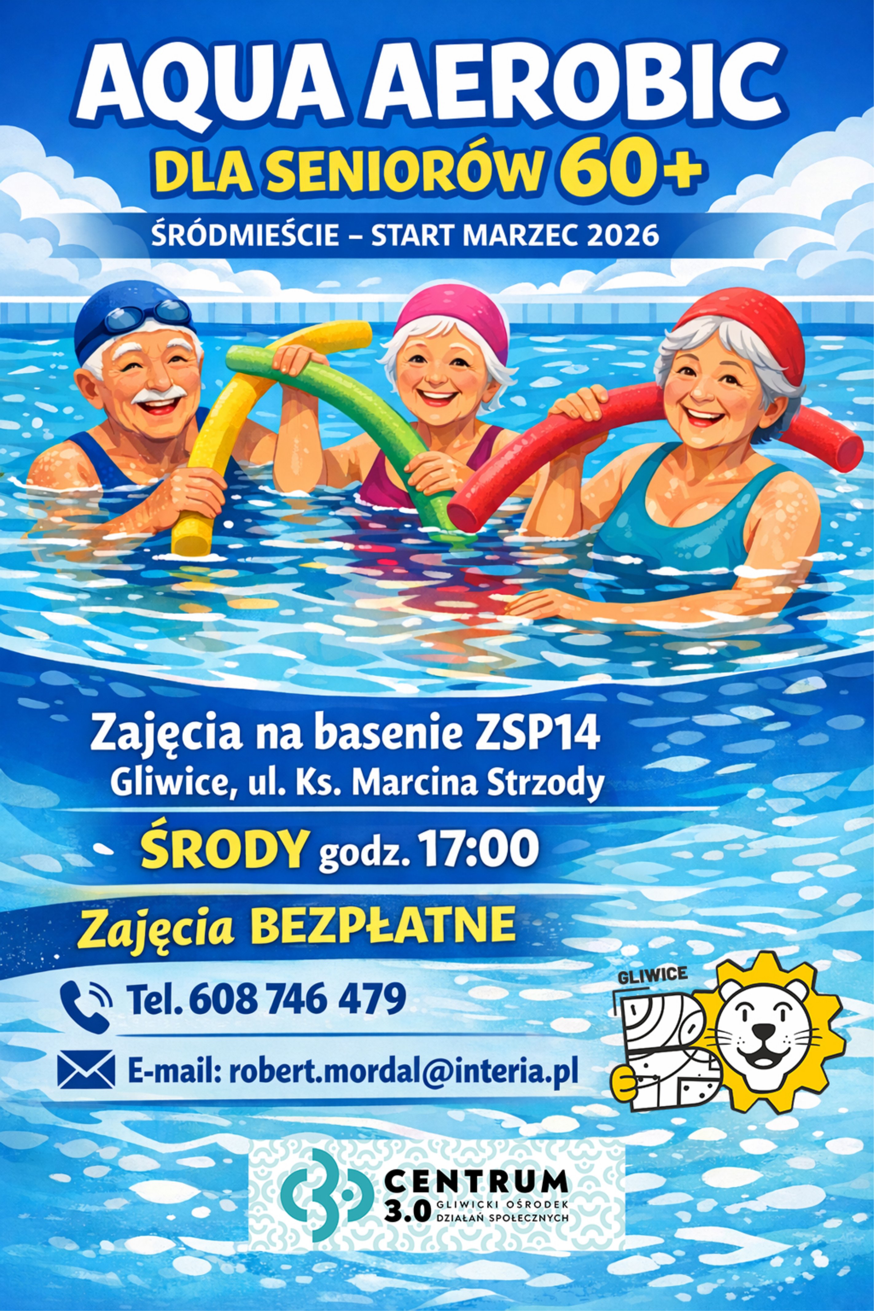 Zapraszamy seniorów w wieku 60+ ze Śródmieścia do udziału w bezpłatnych zajęciach aqua aerobic, które rozpoczną się w marcu 2026 roku.