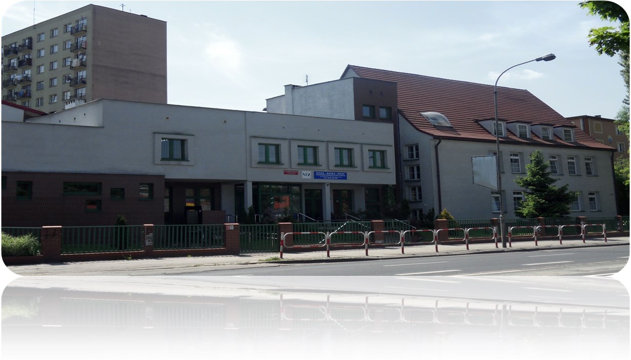 na zewnątrz budynku - przy głównym wejściu