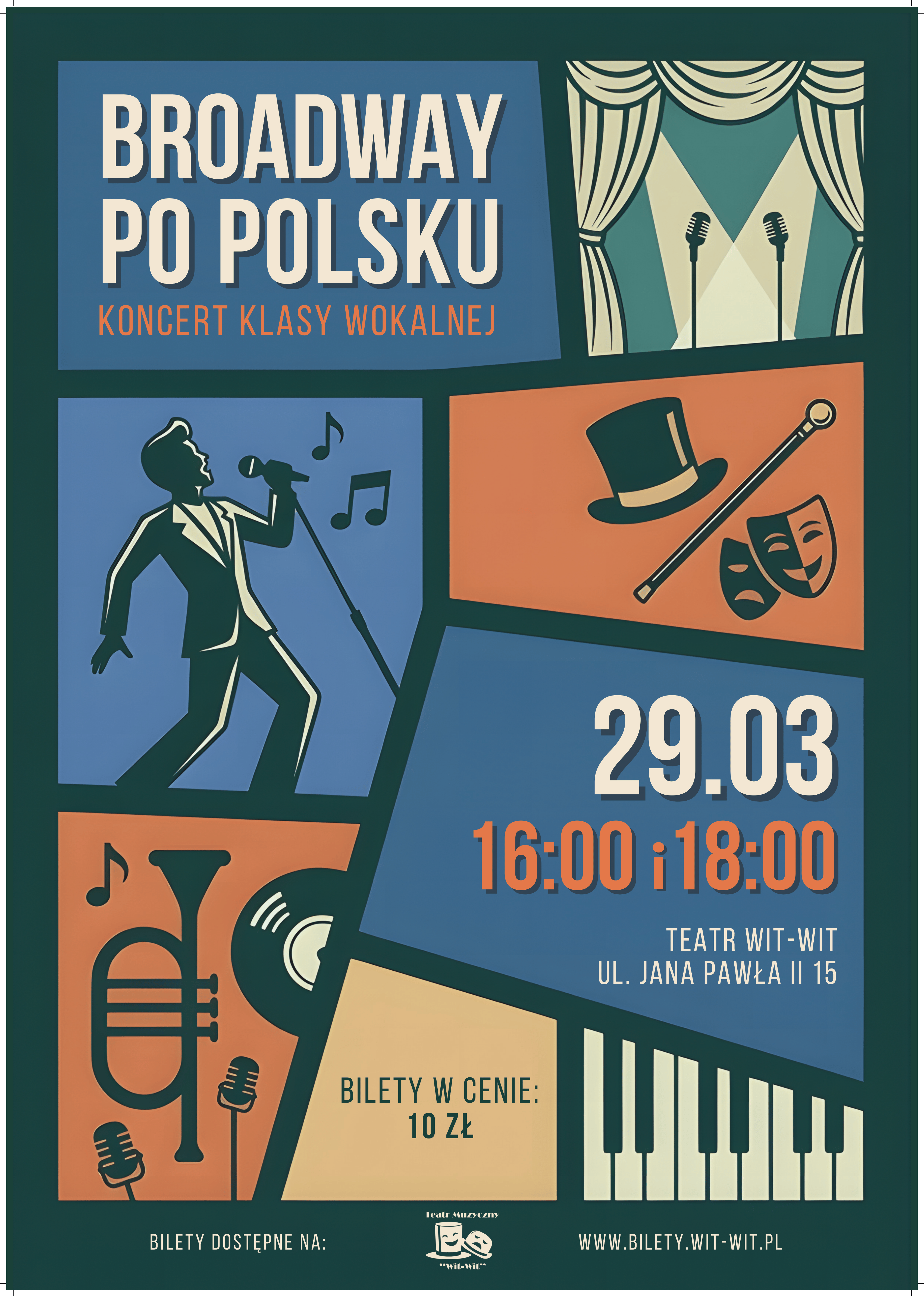 „Broadway po polsku” to koncert klas wokalnych prowadzonych przez Justynę Jarząbek oraz Alicję Witomską, podczas którego młodzi artyści prezentują utwory inspirowane musicalem, teatrem muzycznym oraz muzyką rozrywkową. Wydarzenie stanowi wyjątkową okazję, aby usłyszeć różnorodny repertuar wykonywany przez utalentowanych uczniów rozwijających swoje umiejętności wokalne i sceniczne.