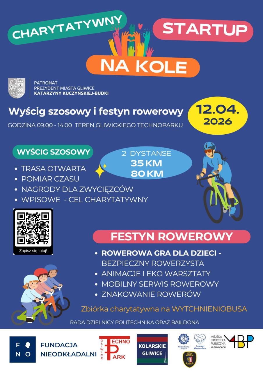 Charytatywny wyścig rowerowy „StartUp na Kole” – Gliwice jadą po dobro! 12 kwietnia, o godz. 09:00 wspólnie ruszamy z Parku Naukowo Technologicznego „Technopark Gliwice”.