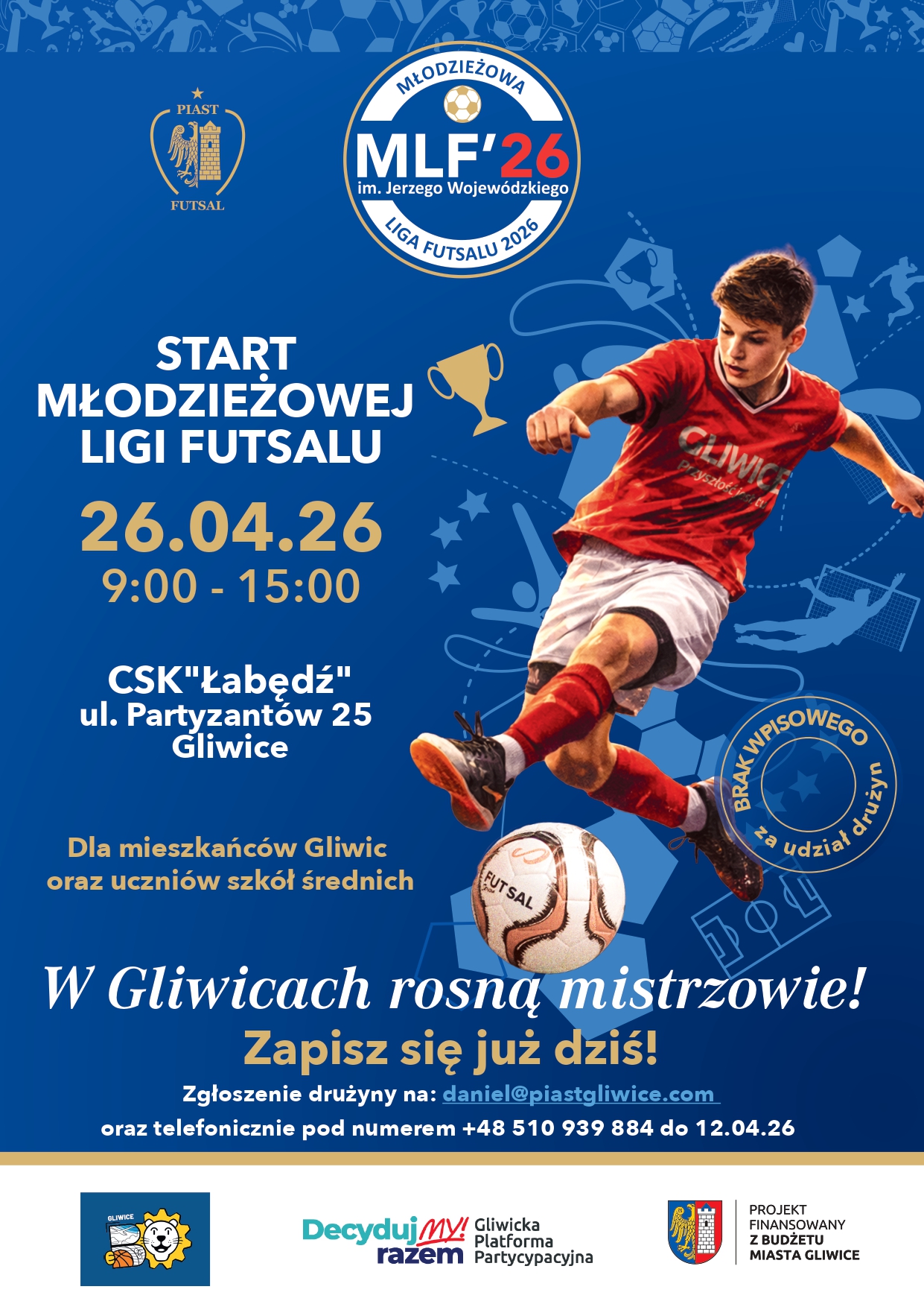 w imieniu organizatorów mamy zaszczyt serdecznie zaprosić reprezentację Państwa szkoły do udziału w nadchodzących rozgrywkach Młodzieżowej Ligi Futsalu MLF’26 im. Jerzego Wojewódzkiego.