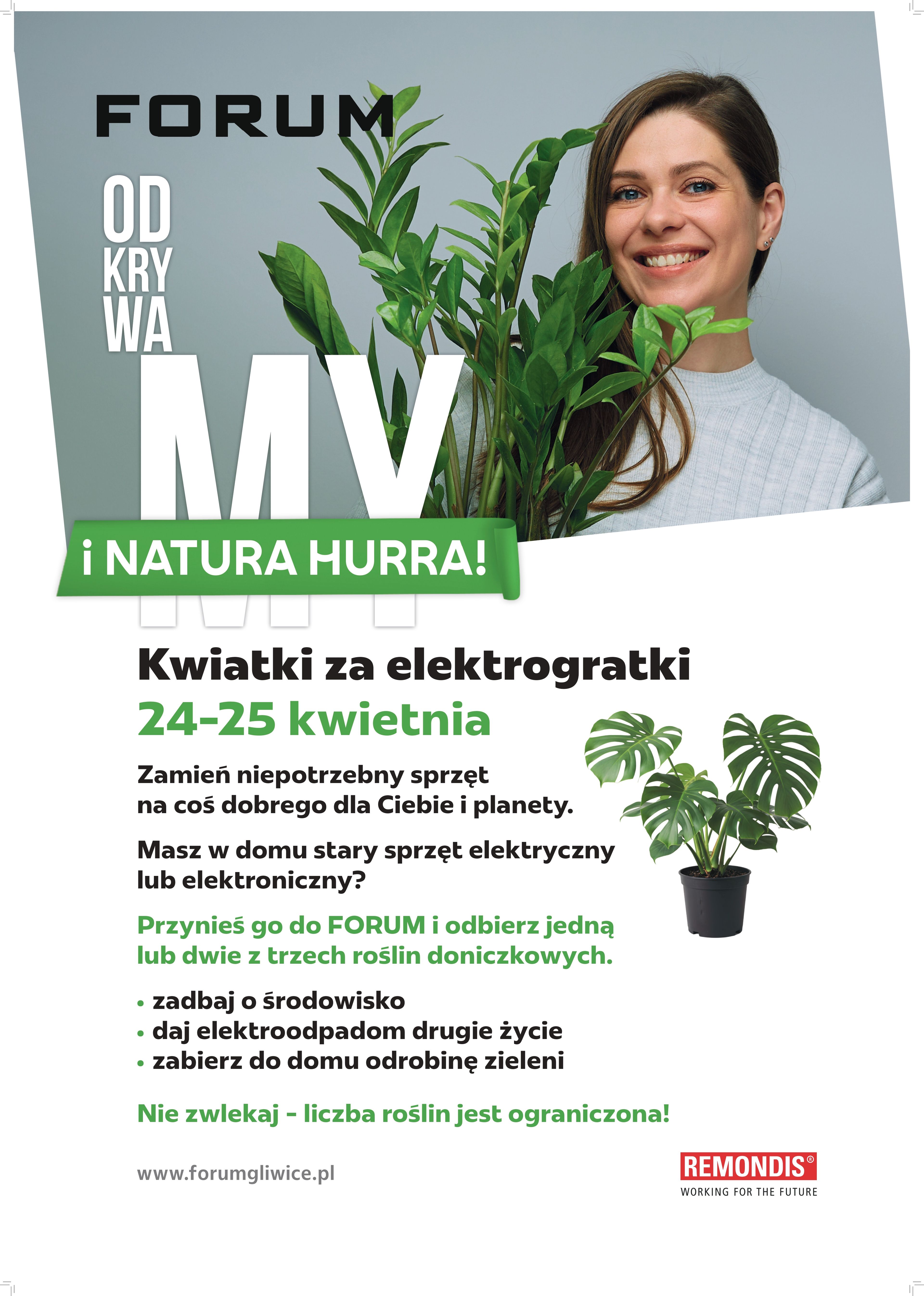 Z okazji Dnia Ziemi Centrum Handlowe FORUM w Gliwicach zaprasza na dwudniową akcję ekologiczną, która odbędzie się 24 i 25 kwietnia. W programie znajdą się m.in. prelekcje edukacyjne dla dzieci, akcja wymiany elektrośmieci na rośliny doniczkowe oraz towarzysząca wydarzeniu instalacja „Ziemia w naszych rękach”.