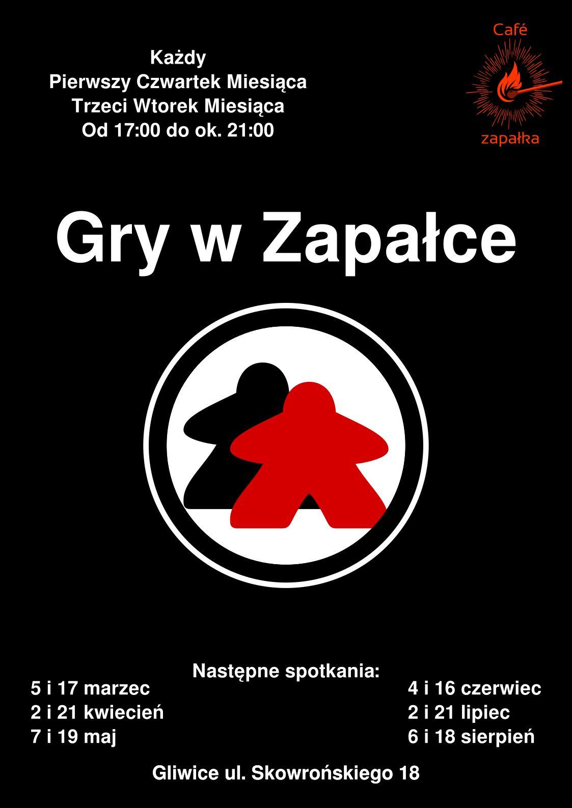 W każdy pierwszy czwartek i trzeci wtorek miesiąca zapraszamy do zagrania z nami w Café Zapałka między 17:00 a 21:00.